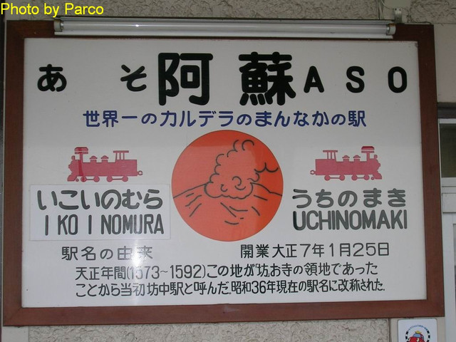 從「九州橫斷特急」紅通通的車廂走下車,超特急的眼前,是車站斗大的站名招牌「阿蘇(Aso)」。高海拔地勢加上正逢冬季,讓超特急冷得直打哆嗦,趕緊披上圍巾保暖。