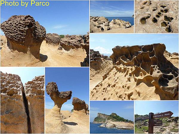 在地質公園內的海岬上,經過長久時間風化與侵蝕而成的地質,呈現多變的風貌,不論是香菇頭(蕈狀岩)、燭台、壺穴、蜂窩石還是平台,都讓人嘖嘖稱奇,讚嘆大自然的力量,也是大自然賞賜的珍寶。
