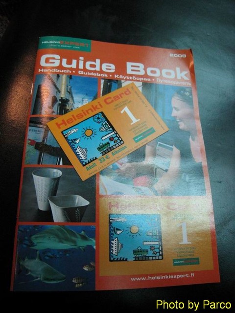 夢想超特急在芬蘭機場的國際航廈旅遊服務中心(Information desk)購買了「赫爾辛基卡1日券(Helsinki Card 1 day)」。購買的同時,除了得到1張未註明日期的空卡外,還可索取1本導覽手冊(Guide Book),內容同時以英語、瑞典語、芬蘭與、德語與俄語記載了卡片的優惠範圍與使用須知,全部濃縮在約80頁的小冊子中,金價係告裡嗨啦